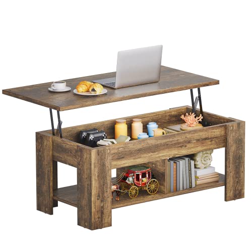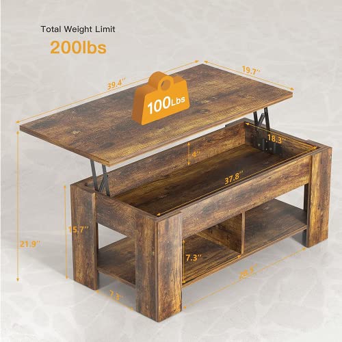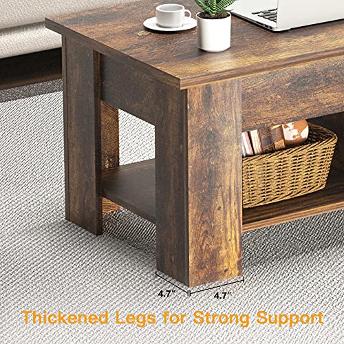 Coffee Table Lift Top with Storage Compartment and Separated Open Shelves, Pop Up Coffee Table for Living Room, 39.4in L, Vintage Brown