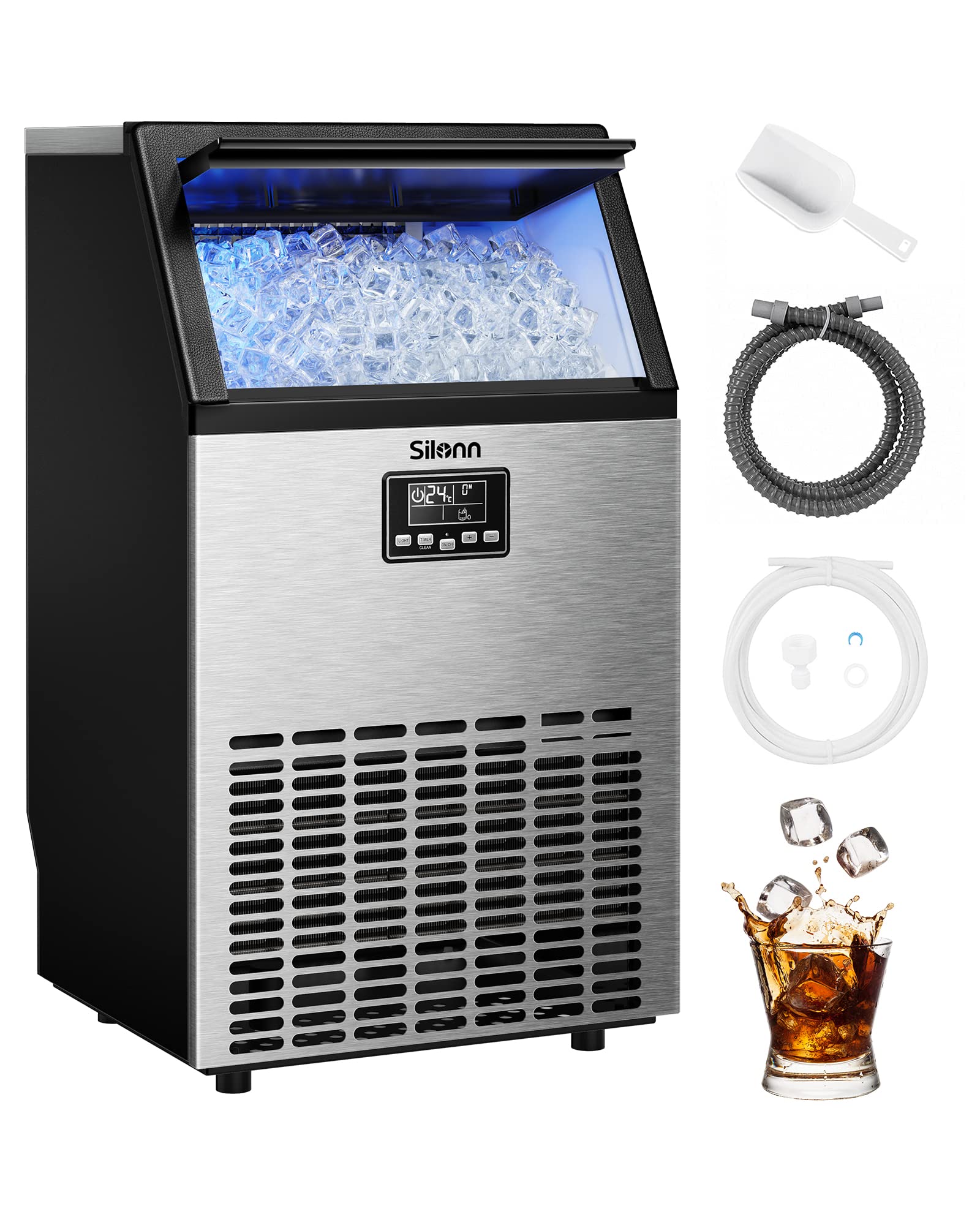 Two Water Supply Options: Silonn’s commercial ice maker machine features two water supply options. Choose to either add water manually or connect the commercial ice machine to a faucet. Includes ice scoop, 6.6 ft drain hose, water quick connector, and 9.1 ft ice transferring hose.