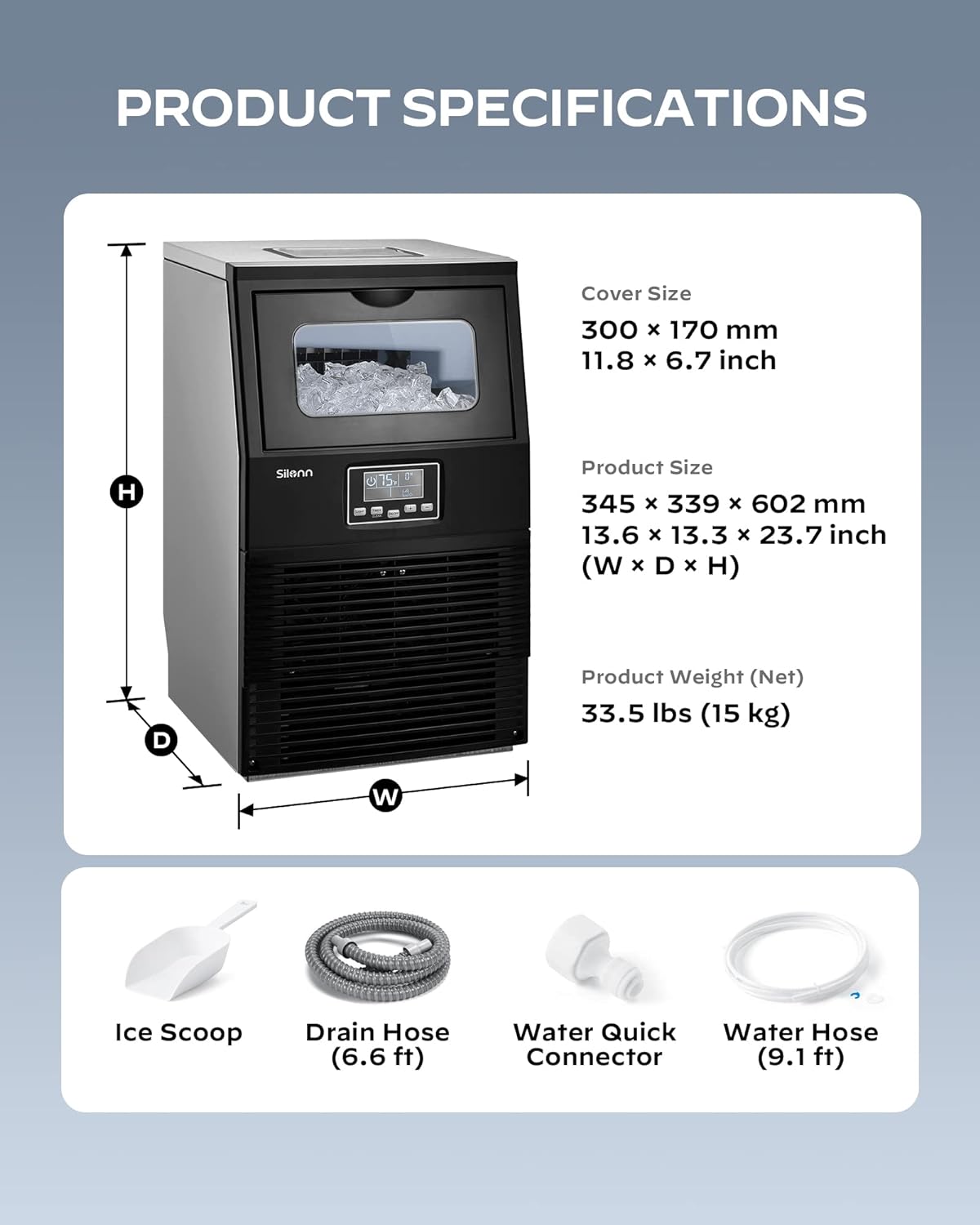 Two Water Supply Options: The commercial ice maker machine features two water supply options. Choose to either add water manually or connect the commercial ice machine to a faucet. Includes ice scoop, 6.6 ft drain hose, water quick connector, and 9.1 ft ice transferring hose.