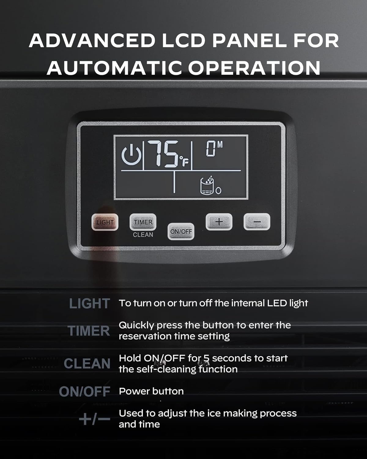 Easy to Operate: One simple panel makes the commercial ice machine easy to operate. Adjusting the timer results in thin, medium, or thick ice cubes. When water runs out, an alarm will sound to alert for refill. The self-cleaning function helps to keep the under counter ice maker working properly.