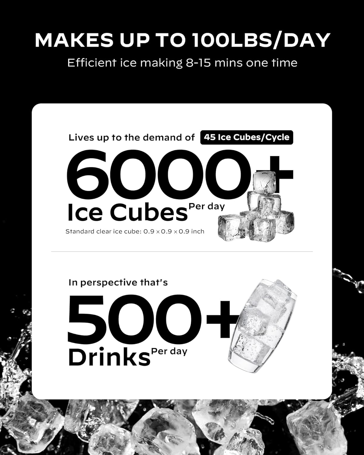 GIGANTIC ICE QUANTITY! – commercial ice maker can produce ice in just 8-15 minutes. With a creating power of 90-100lbs ice daily, that's a professional-sized punching bag. The high production rate ice maker will produce new ice faster, well enough for you to keep up the supply levels during busy times, this freestanding ice maker machine can easily sustain the house, kids, and outdoor parties. Saving you money and time.