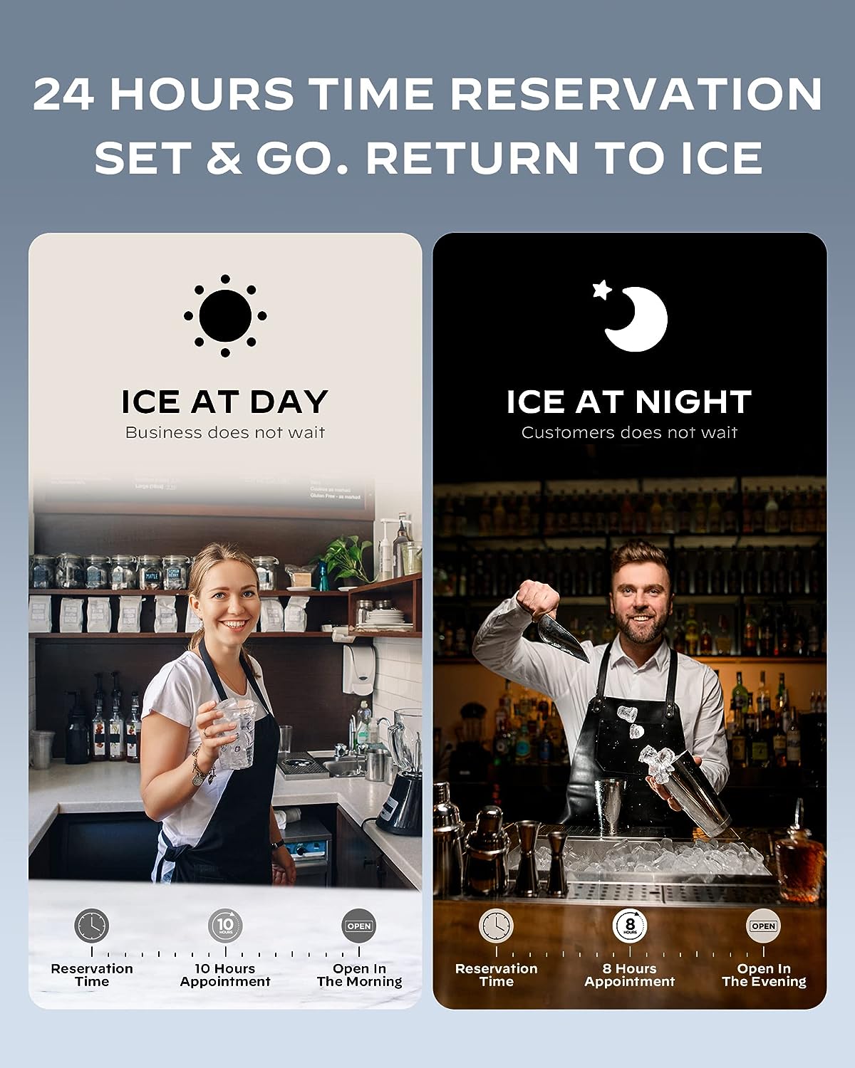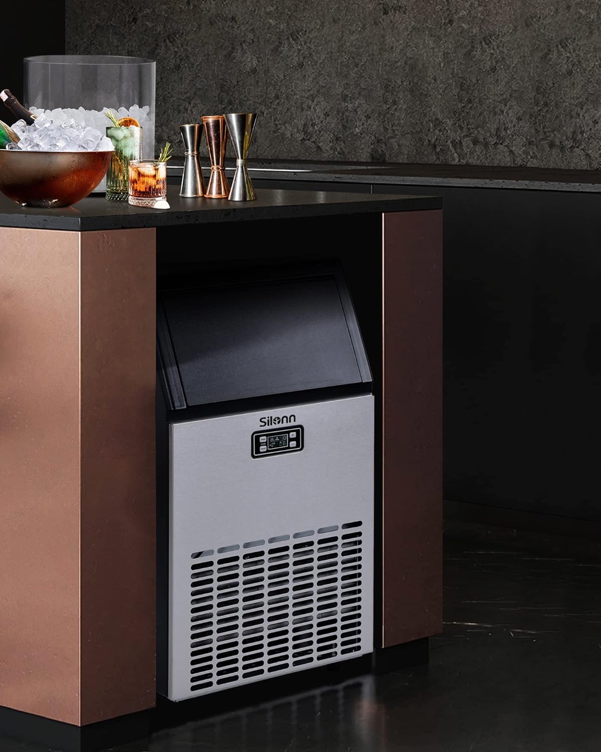 PURE CLARITY ICE QUALITY: Whatever the usage is for; Keeping food fresh, creating cold drinks, chilling beers, and champagne, it all comes true with an ice maker. Square ice cubes are featured with slow-melting, fine in shape, and pure in clarity and density which is popular in high-end bars, restaurants, and even convenience stores.