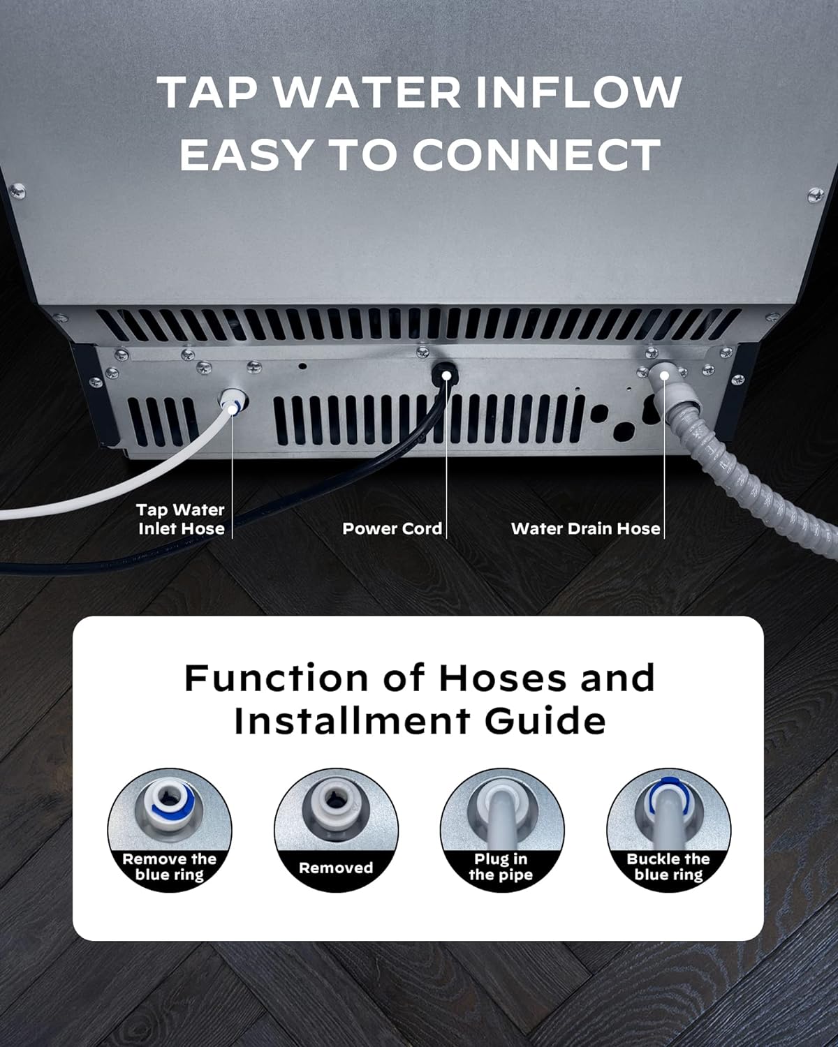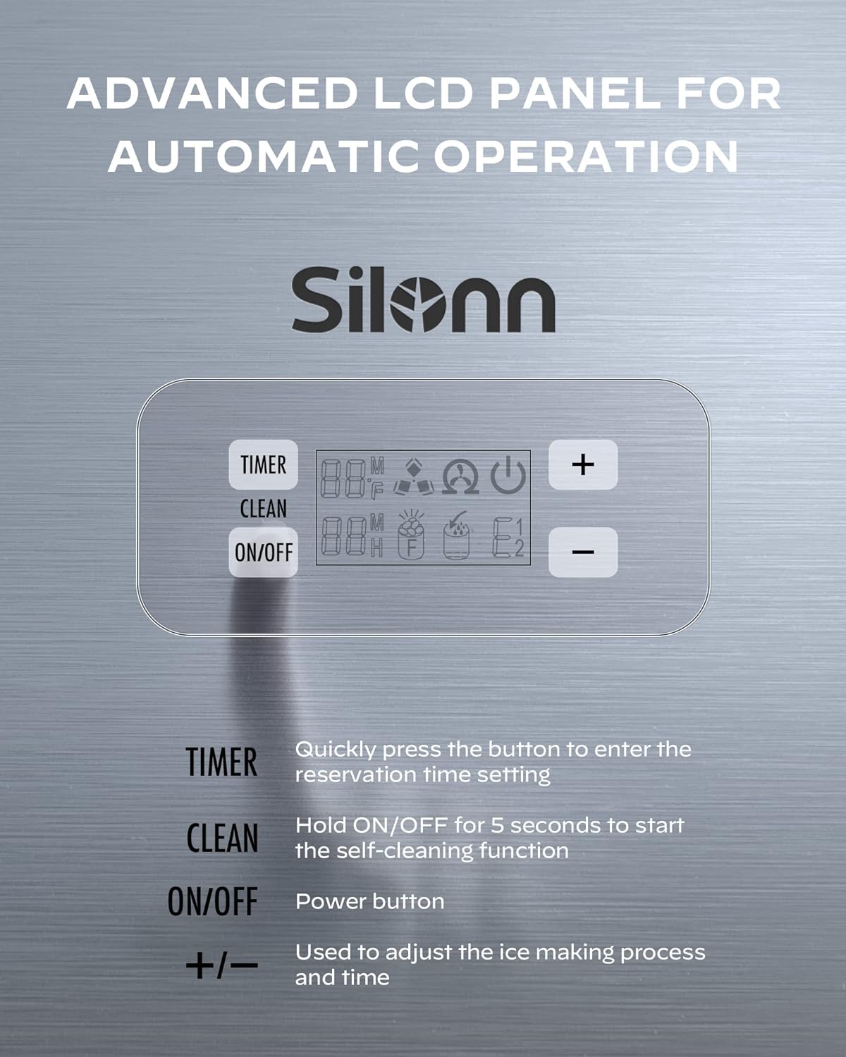 SIMPLE USAGE & CONTROLS: An LCD screen will display the current mode. With one simple panel, you got this ice machine in control. By adjusting the timer, you can have thin, medium, or thick ice cubes. When water runs out, the ice maker will automatically alarm for refilling. As a modern home device, this commercial ice maker is equipped with a self-cleaning function, one press on the panel ends your daily upkeep work.