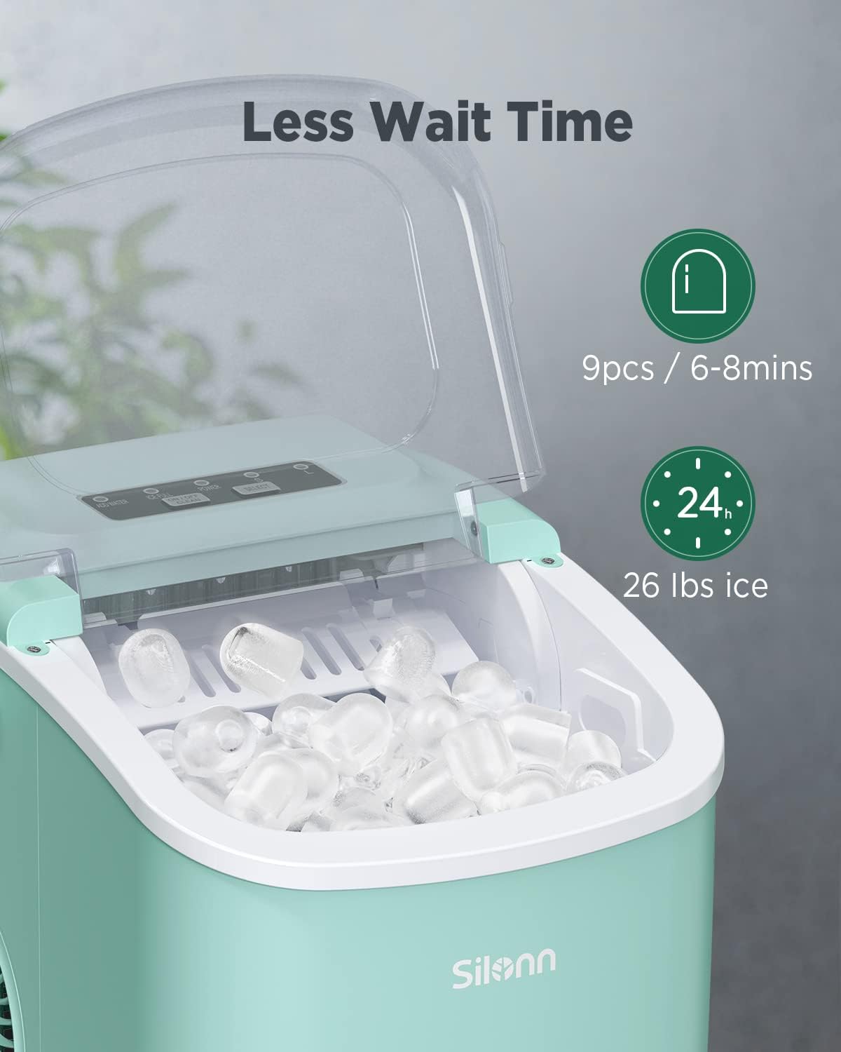 FAST ICE MAKER: The Silonn countertop ice maker only takes 6 minutes to make 9 bullet-shaped ice cubes. Fill the water into the water tank, maximum ice capacity can reach 26 pounds in 24 hours.