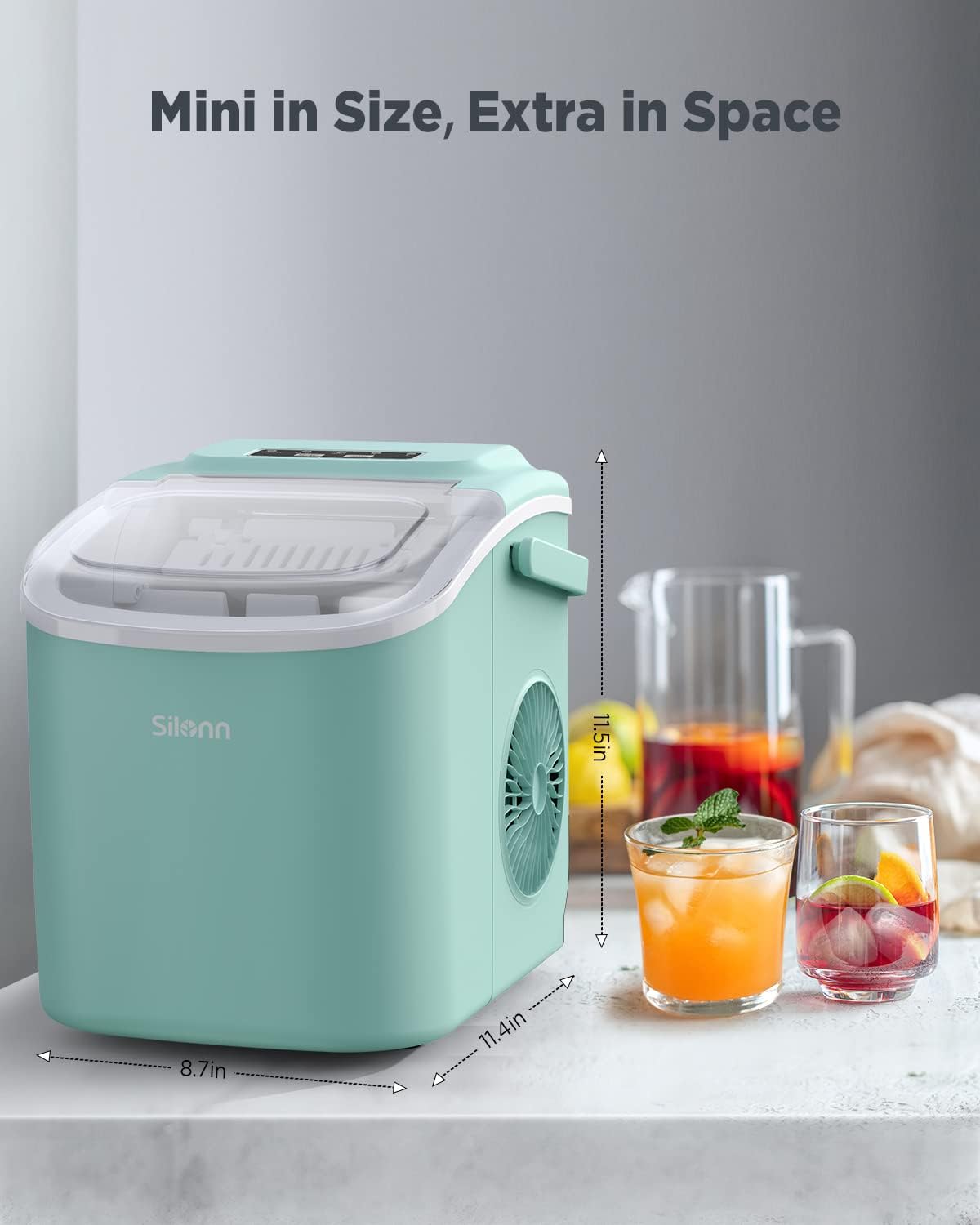 EASY CARRY DESIGN: Silonn ice maker machine is portable with size of 11 x 9 x 11 inches. Our ice maker also has a sturdy handle that makes carrying from room to room even place to place a breeze. Have ice anywhere, anytime.