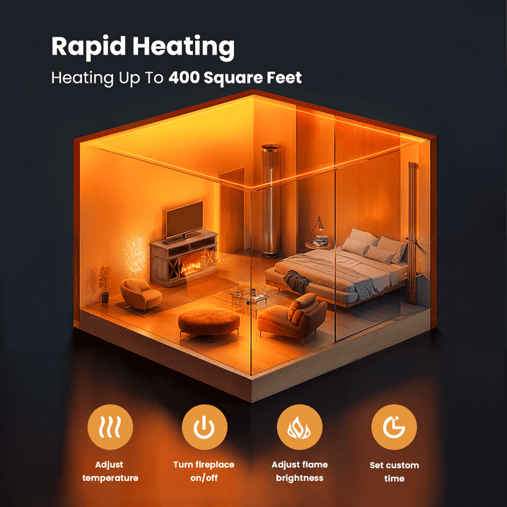 - 【Realistic Flame Effect】Fireplace features LED technology with realistic logs and flame, 50000 Hrs life time led light source. 4 brightness colors are a creating a cozy ambiance and emitting no dangerous emissions or carbon monoxide. 1-8 hrs sleep timer, 64-95°F temperature adjustment.