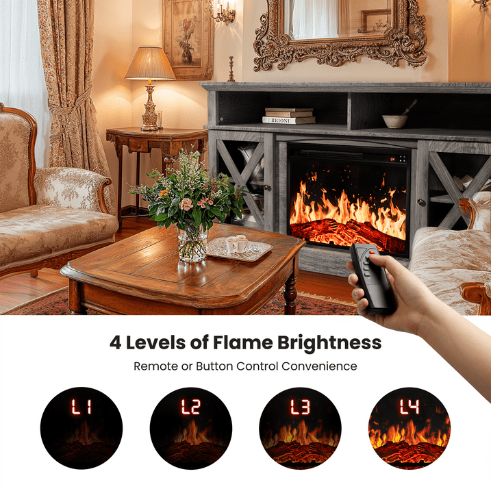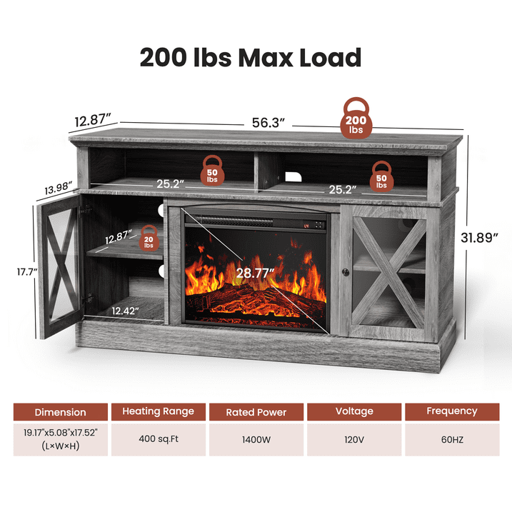 - 【TV Stands with Fireplaces】Upgrade your home with a spacious TV table and 23 inches fireplace with 5000 BTU, heats up 400 sqty, glass window panes and wooden detailing on cabinet doors create a stylish look. Enhancing the overall ambiance of a blend of coziness and farmhouse style while providing functionality.