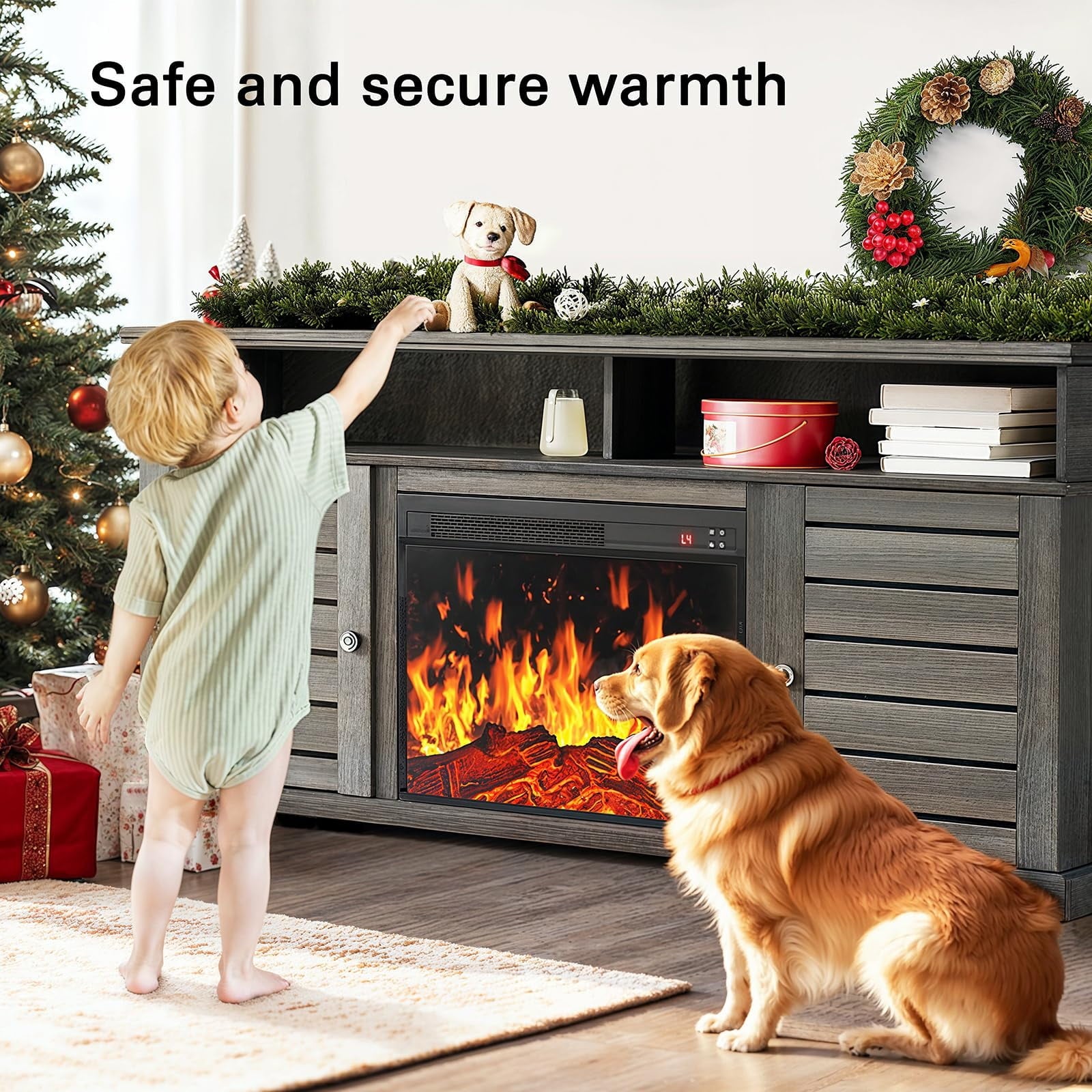 Realistic Flame Effect: Fireplace features LED technology with realistic logs and flame, creating a cozy ambiance and emitting no dangerous emissions or carbon monoxide.