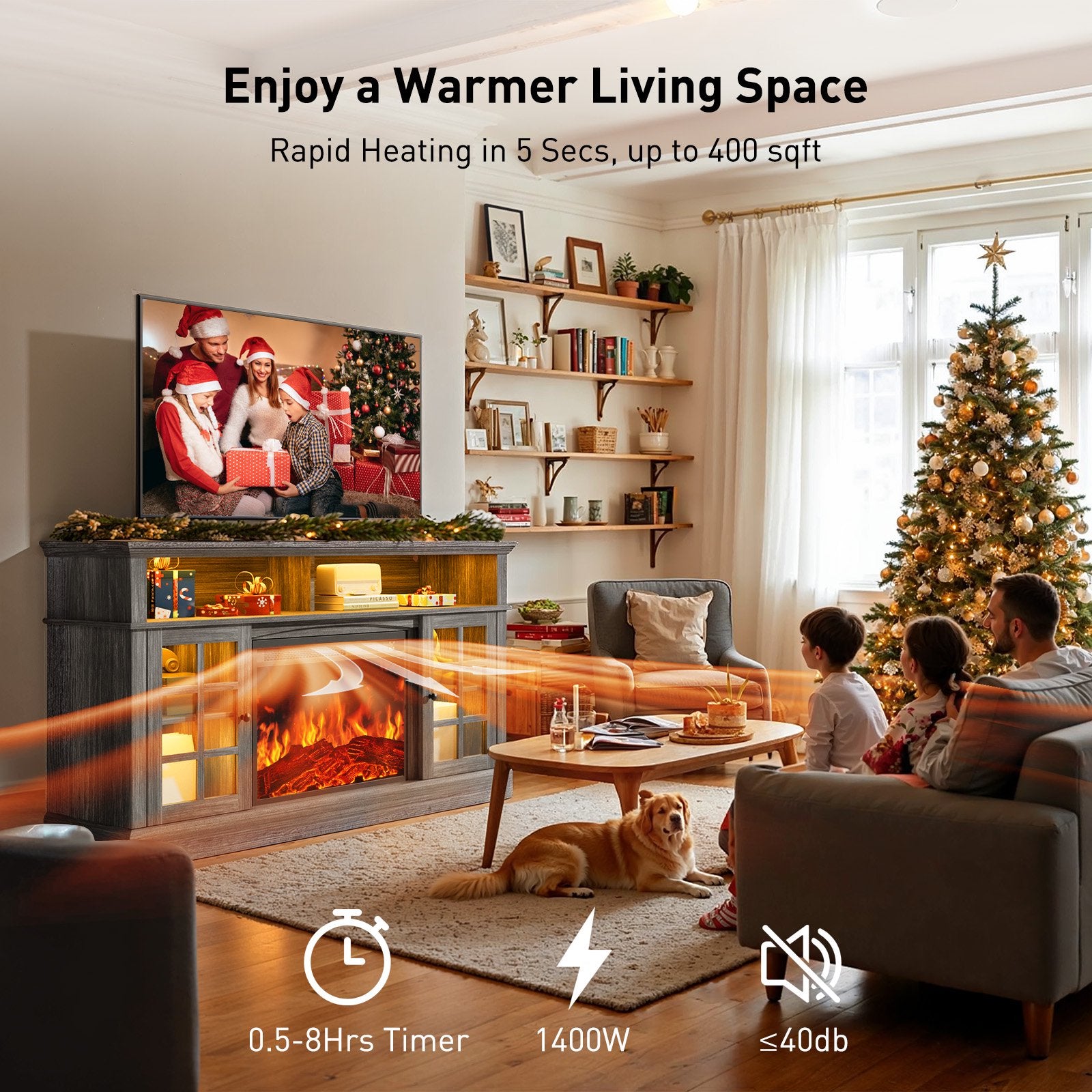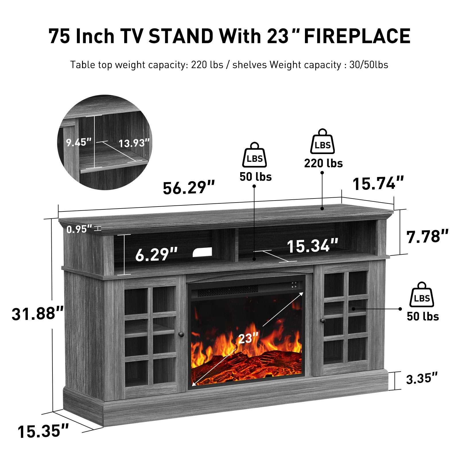 This electric fireplace tv stand for up to 75 inch TVs and up to 220lbs with a fireplace is perfect for your living room or bedroom by adding storage space and heat. The 23” electric fireplace insert can heat a room up to 400 sq.ft. and plugs into a standard 120V outlet.and with 9 temperature options, 4 levels of flame brightness, and 1400W rapid heating system that can warm air in only 5 seconds. The electric fireplace insert features a realistic flame effect that can be used with or without heat to enjoy the ambiance even in the warm summer months. You'll appreciate the long-lasting durability of the piece, thanks to its high-quality manufactured wood construction and sturdy particleboard construction. This storage console features two adjustable shelves on both sides for anything from your electronics to your home decor. With a cord management port at the back of each shelving space, you'll never have to worry about a tangled mess of wires as it'll keep them organized. Enhance your living space with a variety of changeable color LED lights, adding a unique and dynamic ambiance to your entertainment area.This entertainment center combines modern with farmhouse design and is sure to blend perfectly into your living room.