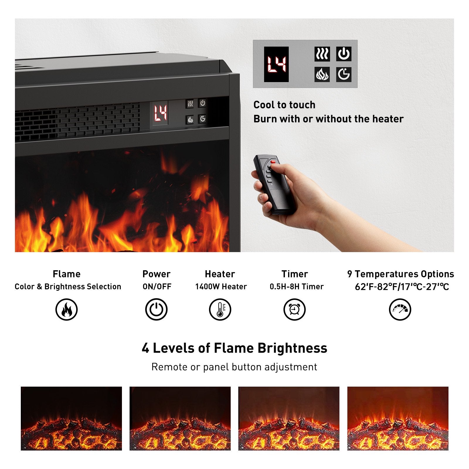 23 Inch Electric Fireplace with Remote Control: CHITOOMA fireplace heaters feature realistic 3D flame effects, glowing logs, and embers. 5000 BTU, heat up in just 5s! Heating for up to 400 Sq.ft. Also, the faux flame effect can be burned with or without heat, creating a warm and dreamlike atmosphere all year round. You can freely control the power switch and easily adjust the flame brightness, temperature, and timer with the included remote control or operating panel.