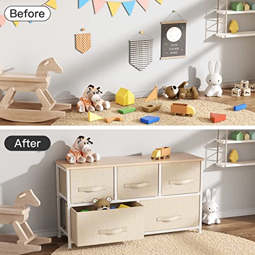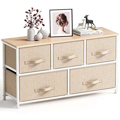 Fabric Dresser, Dresser for Bedroom with 5 Drawers, Wide Dresser Storage Tower Organizer Unit with Wood Top and Easy Pull Handle for Closets, Living Room, Nursery Room, Hallway