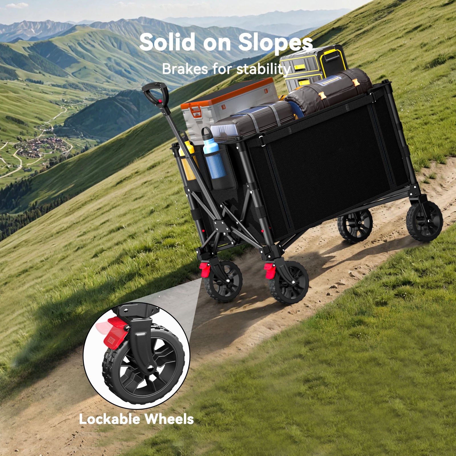 - 【All-Terrain Wheels with Dual Brakes】 Features 2 front wheels with locking brakes to securely hold the wagon in place on slopes or uneven ground. The thick, shock-absorbing tires provide smooth rolling over sand, gravel, grass and pavement while resisting wear and tear.