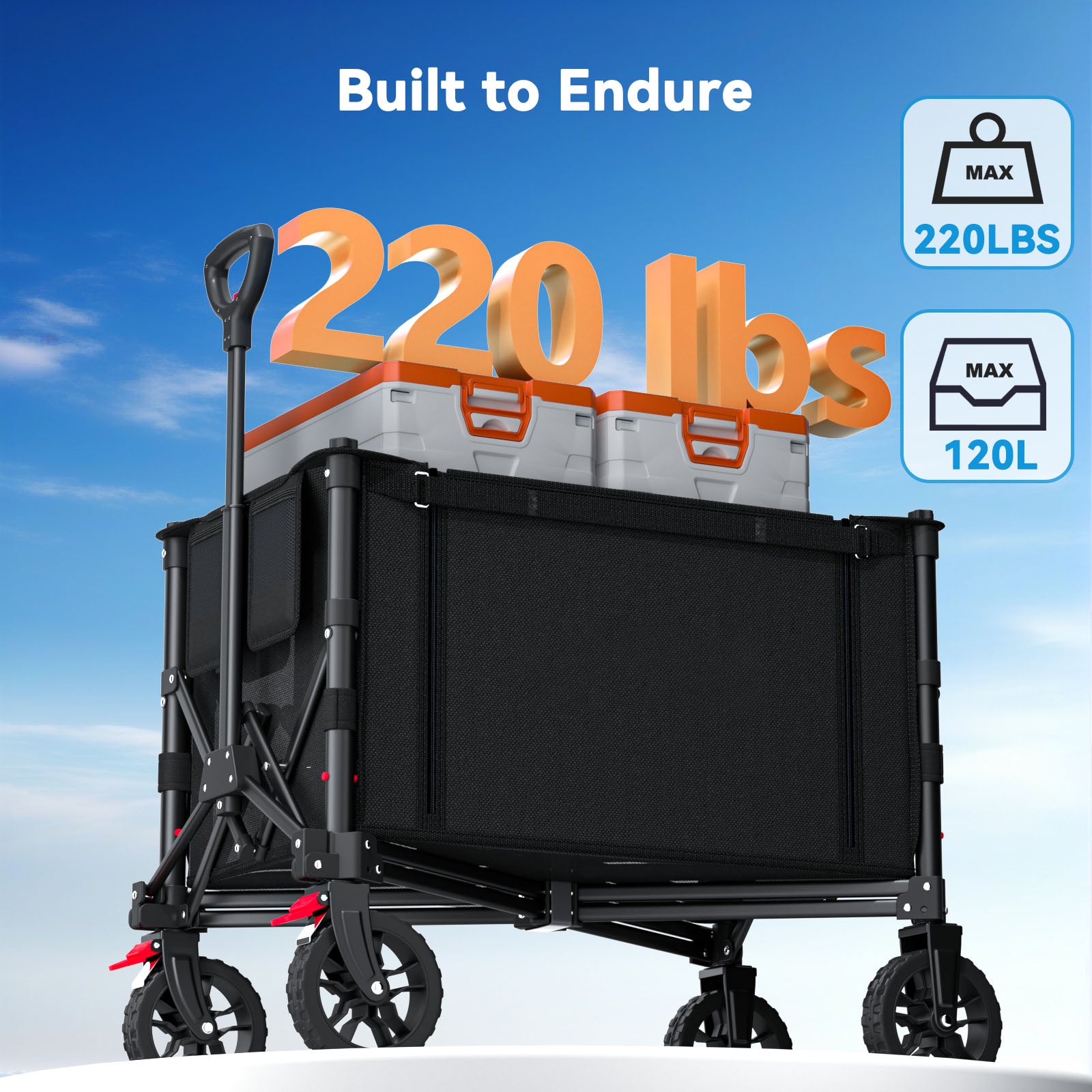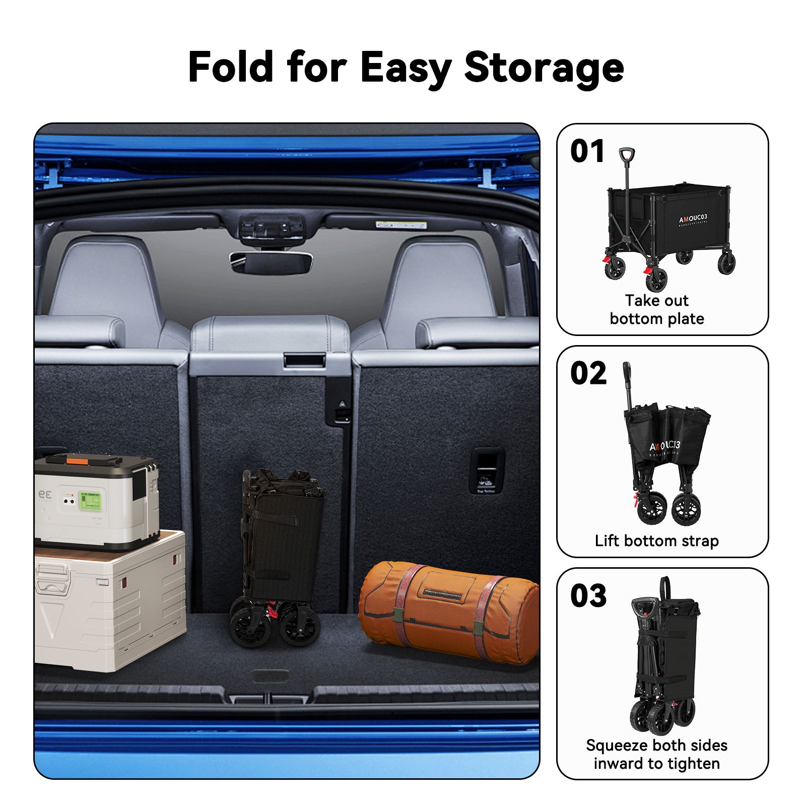 - 【Lightweight & Compact Folding Design】 Weighing only 14.7 lbs, this folding camping wagon is light yet sturdy, making it effortless to carry and maneuver. The one-step collapsible design lets you fold it flat in seconds—perfect for compact storage in car trunks, closets, or tight spaces.