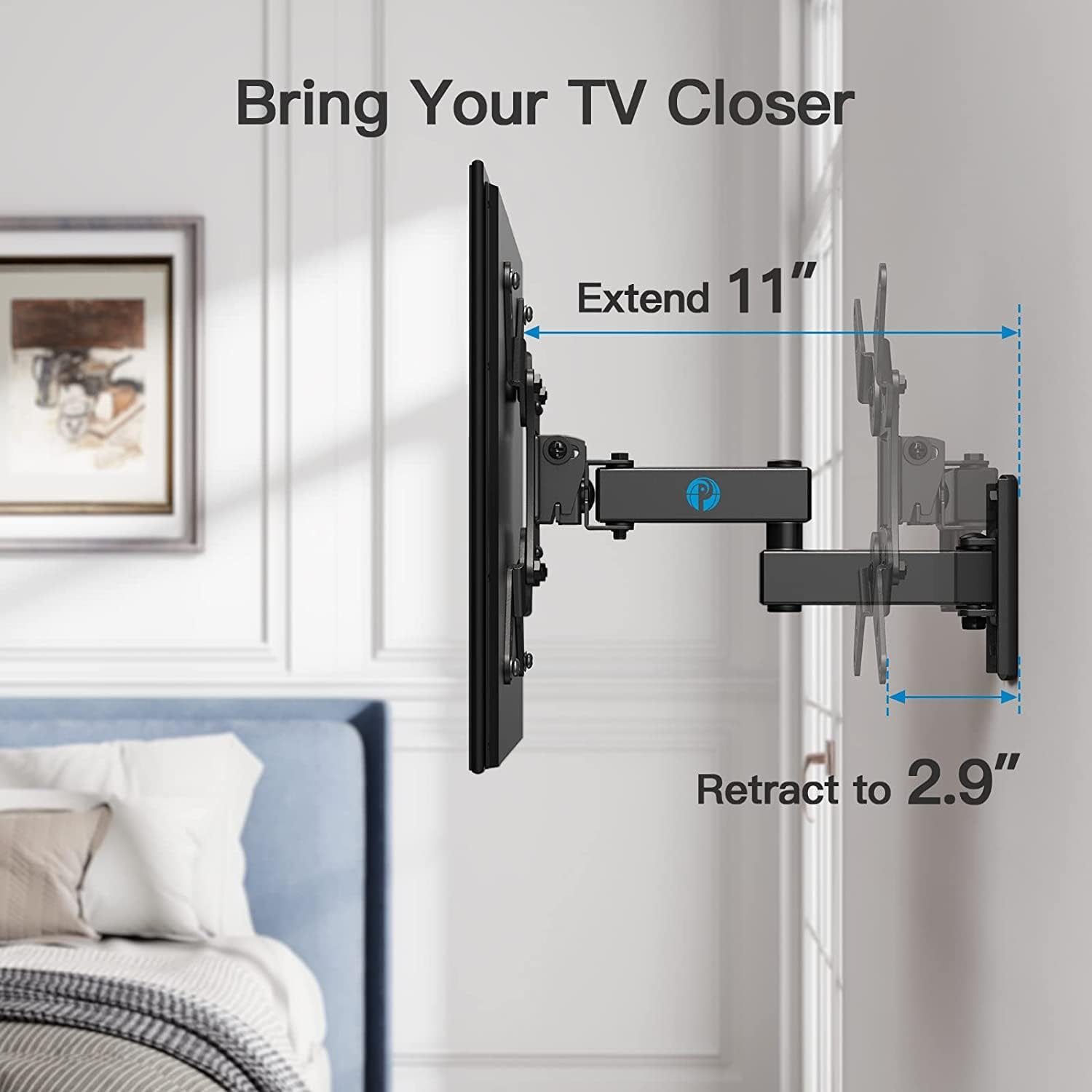 Great Space Saver: The TV wall mount can extend 11″ to bring your TV closer and retract back to 2.9″ from the wall for a low-profile look. Designed to be mounted on a single wood stud, this corner TV wall mount can be installed in tight areas to maximize your living space.