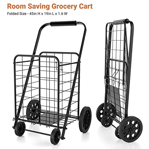 - Space Saving Foldable Grocery Cart: Folding design makes it more convenient to carry or store the grocery cart in the car, trunk, under seats, or other spaces without taking up too much room. The compact shopping cart is portable for camping, shopping, gardening, sports, or anywhere you go.