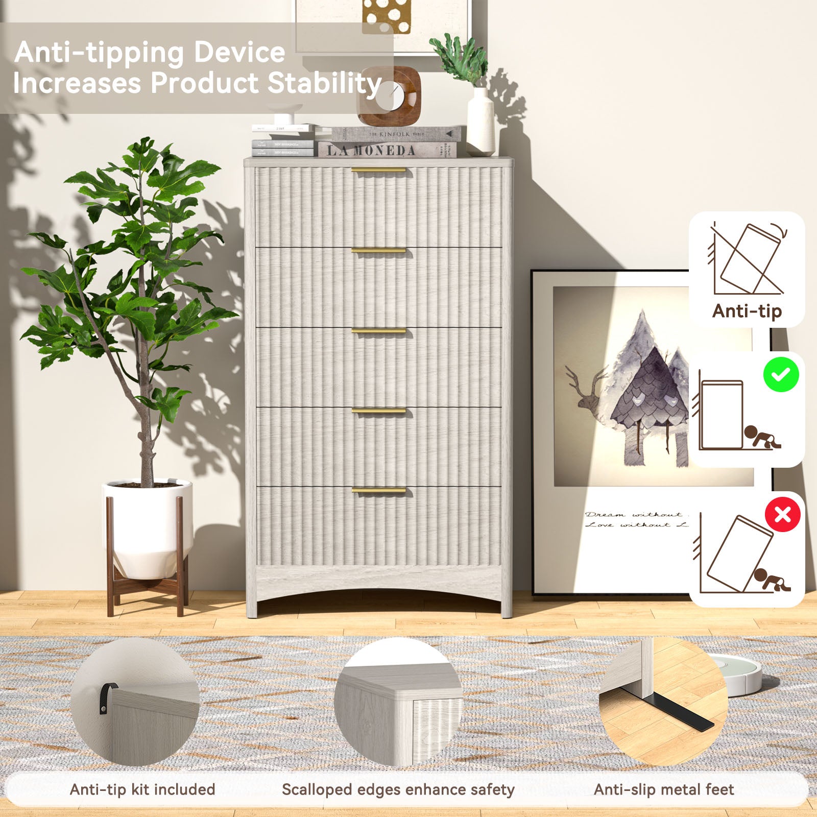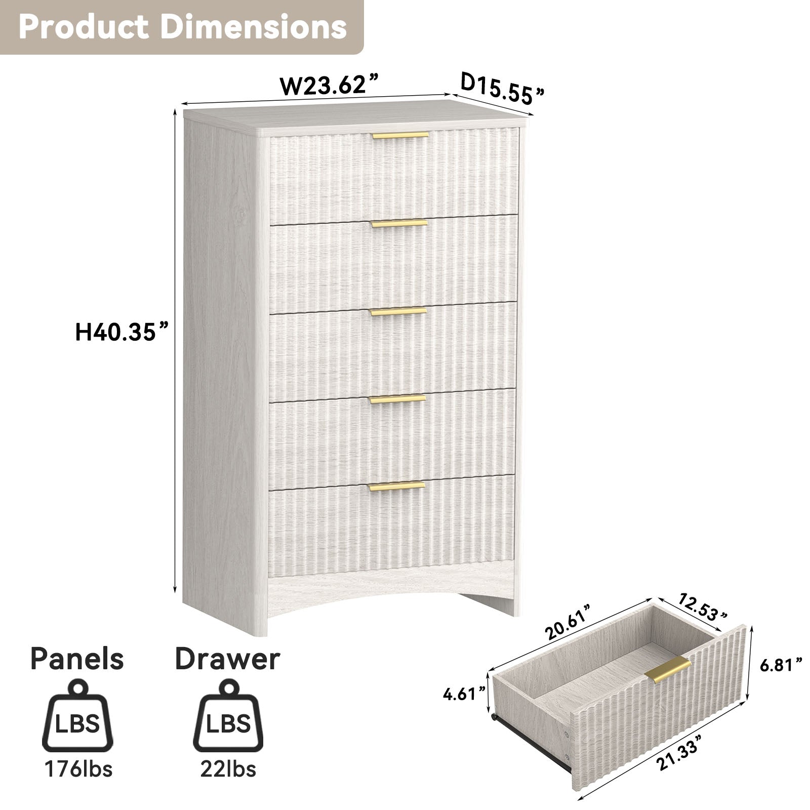 Add modern texture and ample storage to your home with the CHITOOMA 5-Drawer Dresser. Featuring a fluted wood front, gold handles, and a natural finish, this tall storage cabinet blends style and function for your bedroom, hallway, or living room.