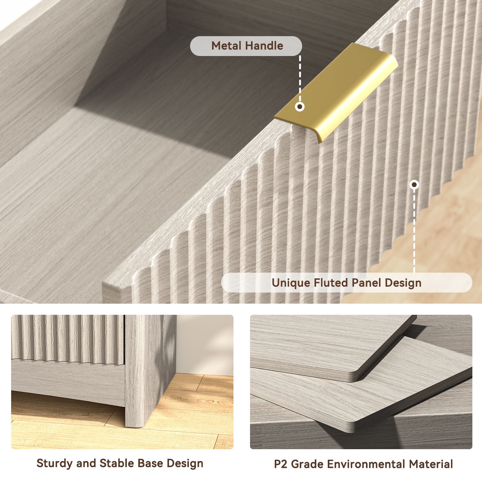 - Modern Fluted Design – Textured fluted drawer fronts and sleek gold handles add a stylish, upscale touch to any room.