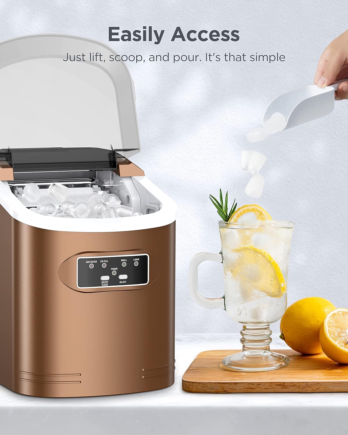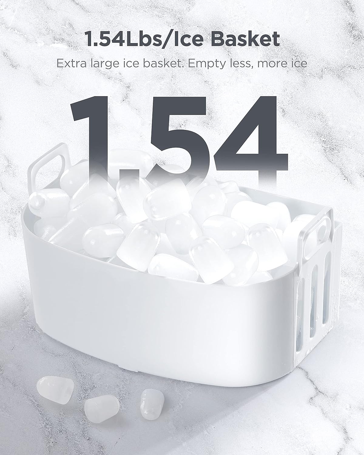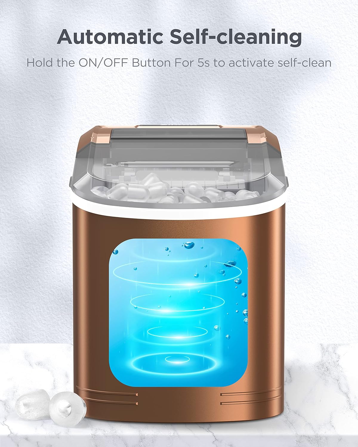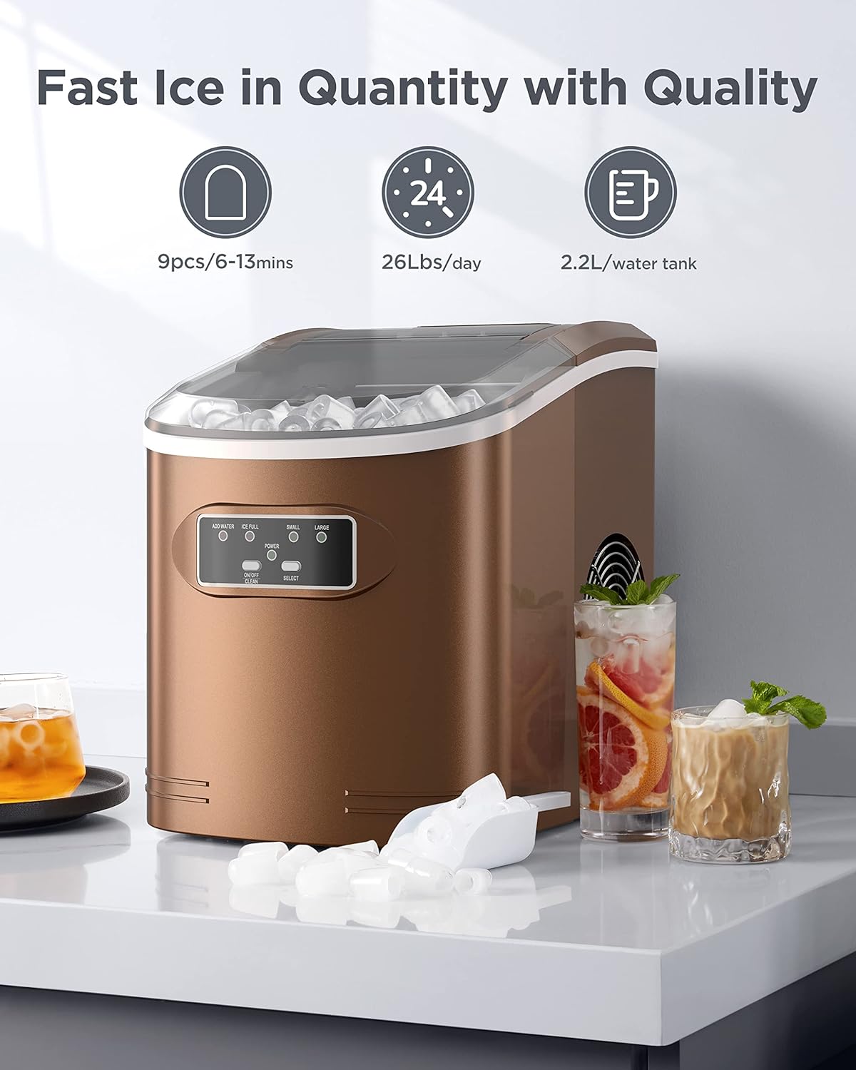 FAST ICE MAKER: The ice maker only takes 6 minutes to make 9 bullet-shaped ice cubes. Fill 2L of water into the water tank, maximum ice capacity can reach 26 pounds in 24 hours.
