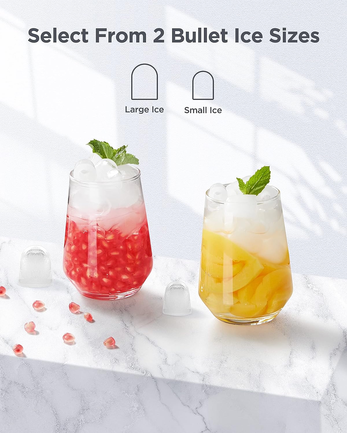 TWO SIZES OF ICE CUBES: You can make two different sizes of ice cubes. Small ice cubes can chill seafood and beer keeping it fresh and cold. Large ice cubes are more suitable for beverages to achieve a rapid cooling effect.