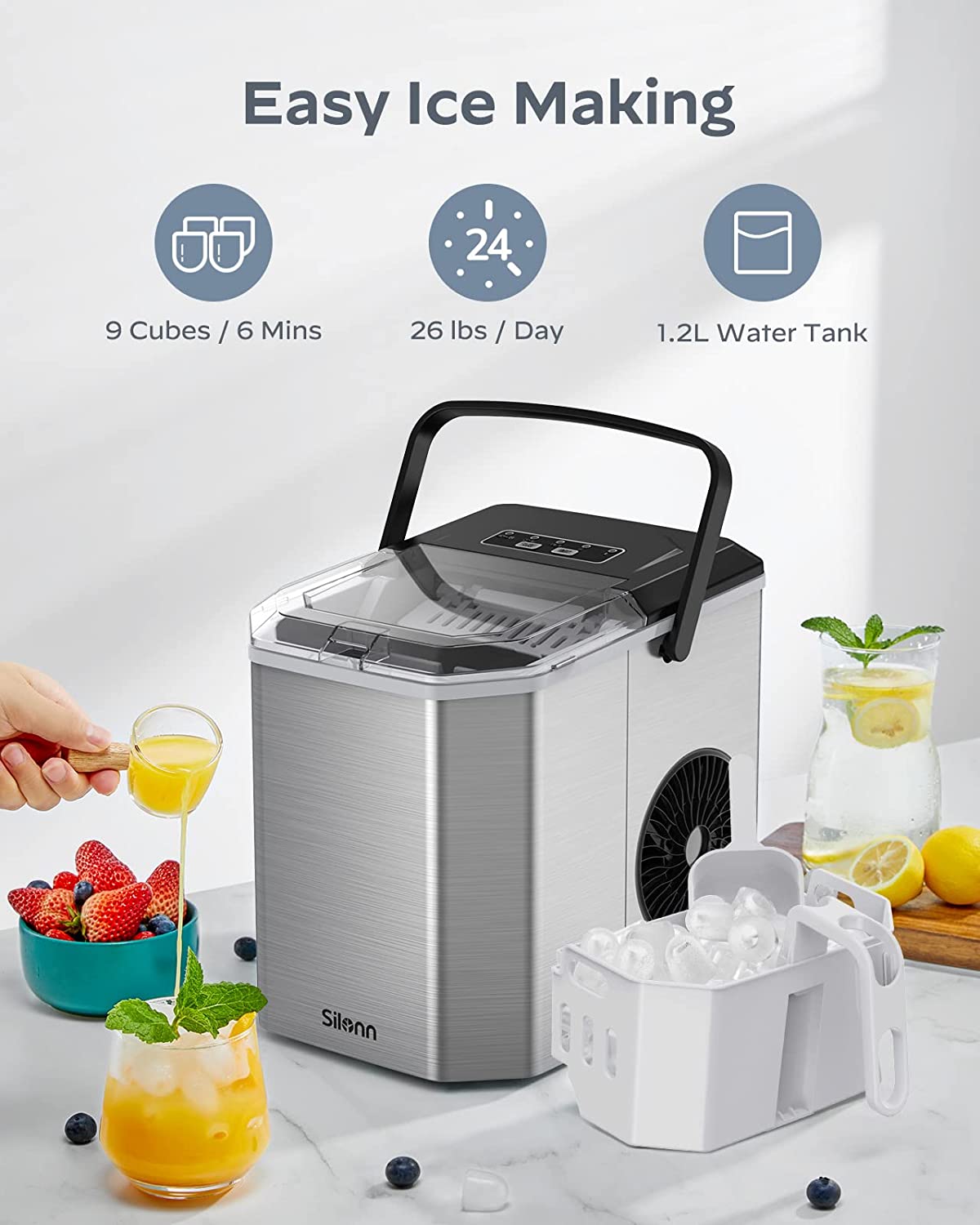PERFECT COMPACT SIZE: Measuring only 8.7 x 11.4 x 11.6 inches in size, the Silonn ice maker can easily fit on a counter, kitchen island, or desk without taking up too much space. Thanks to the 35db low-noise design, you can run the machine without loud distraction.