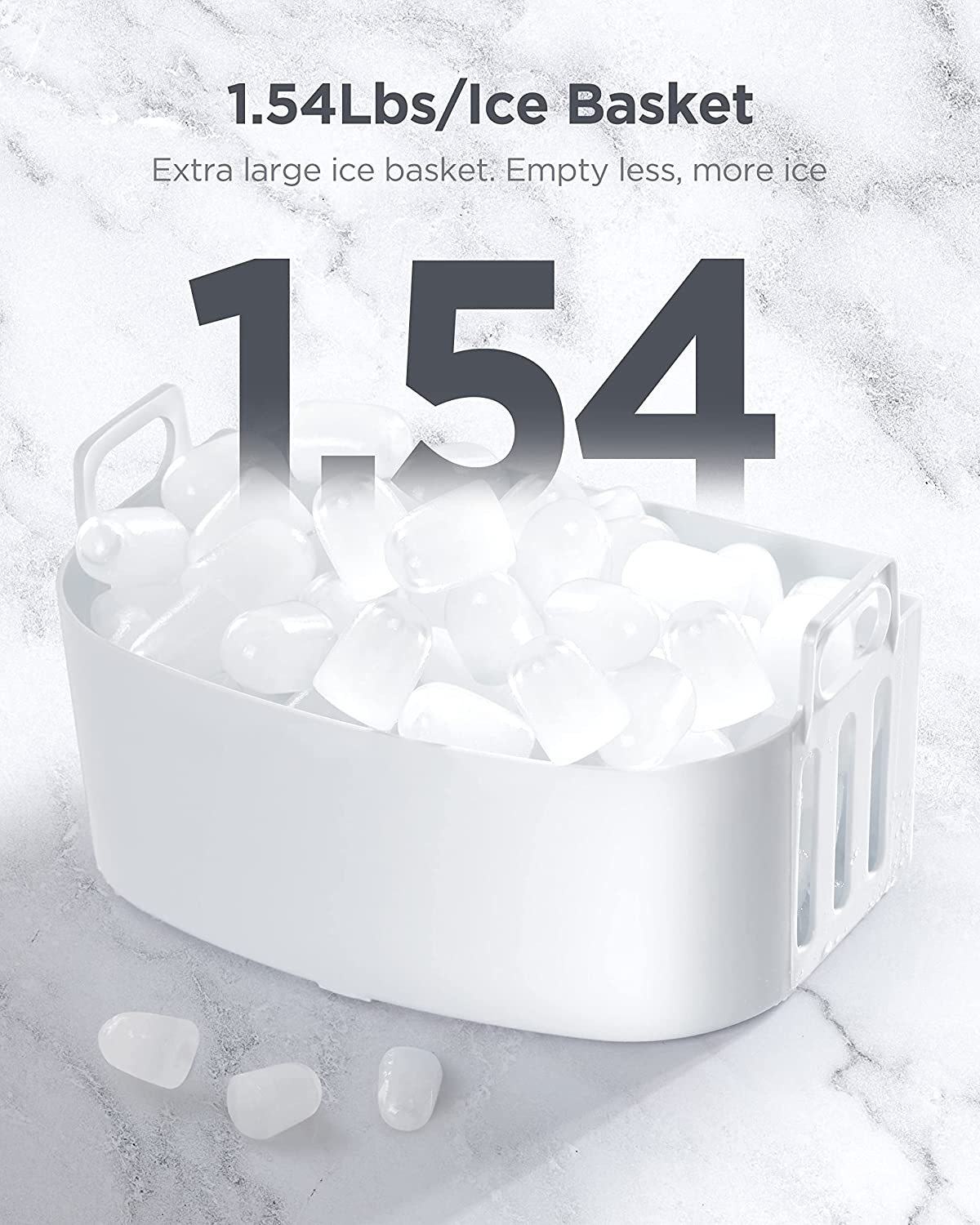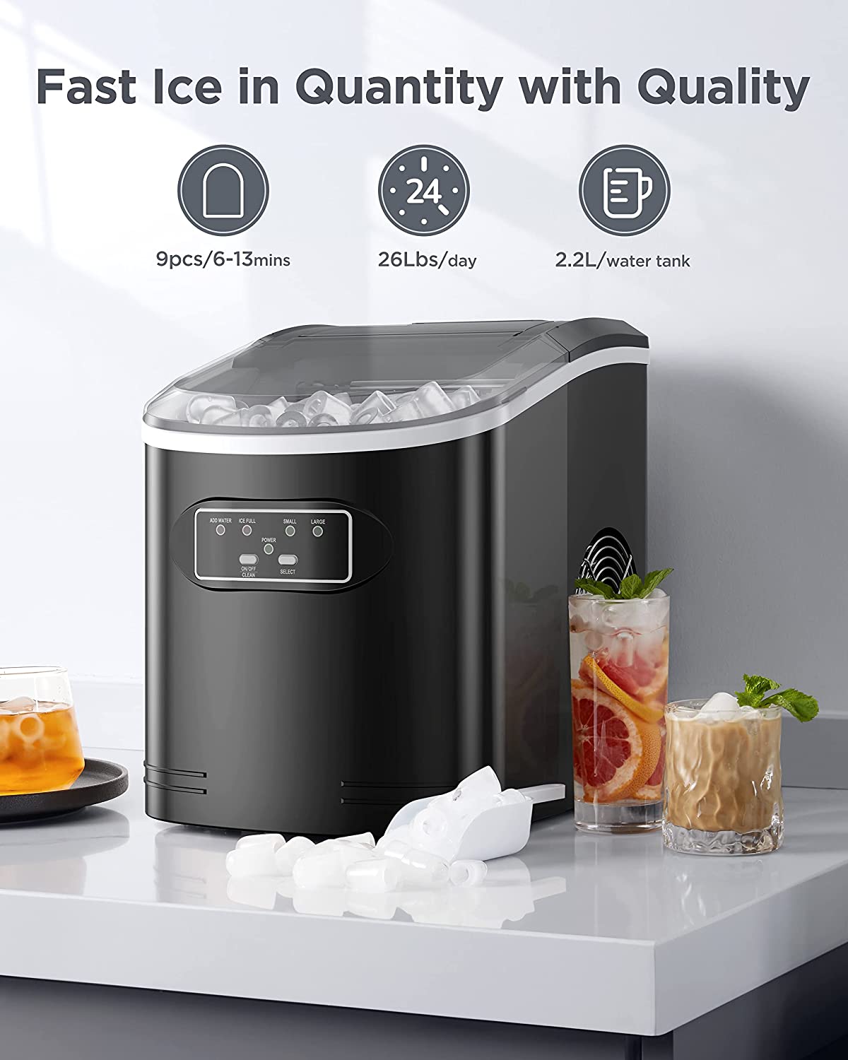 FAST ICE MAKER: The Silonn ice maker only takes 6 minutes to make 9 bullet-shaped ice cubes. Fill 2.2L of water into the water tank, maximum ice capacity can reach 26 pounds in 24 hours.