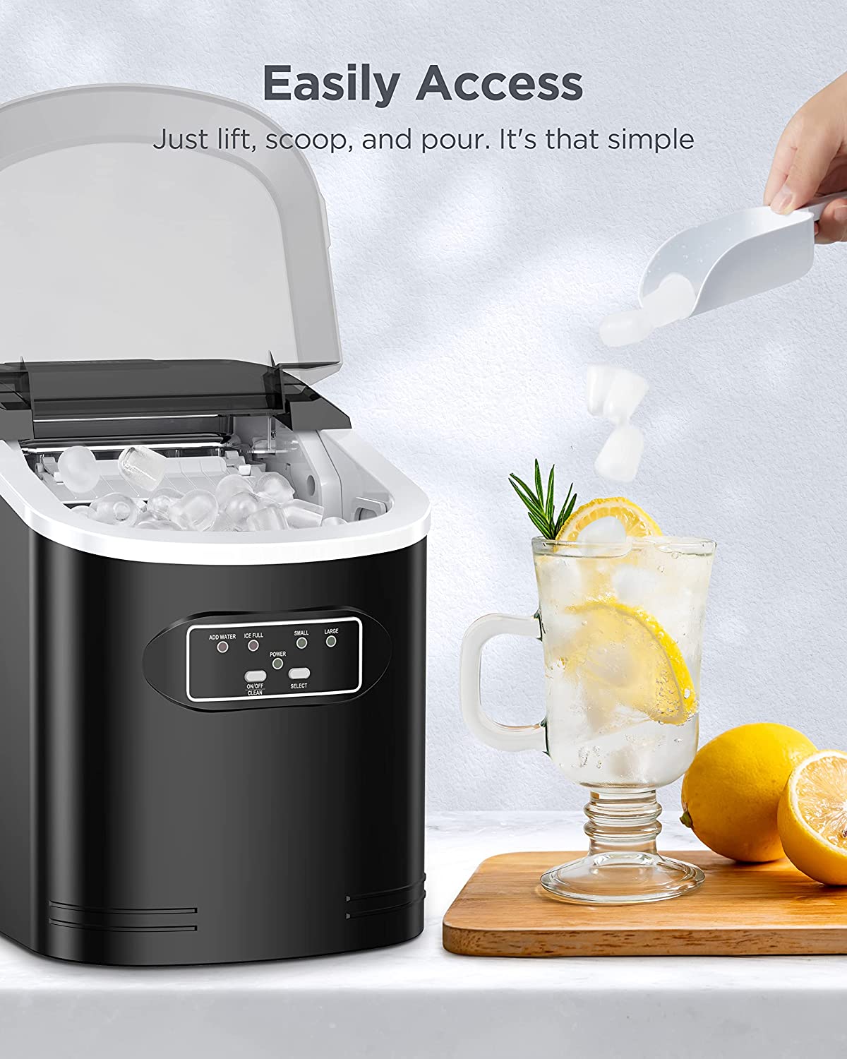EASY TO CONTROL: The control panel is very easy to operate. Fill the ice maker with water, press the ON button, select the size of the ice cubes and that’s it. When the water is insufficient or the ice basket is full, the indicator light will turn on.