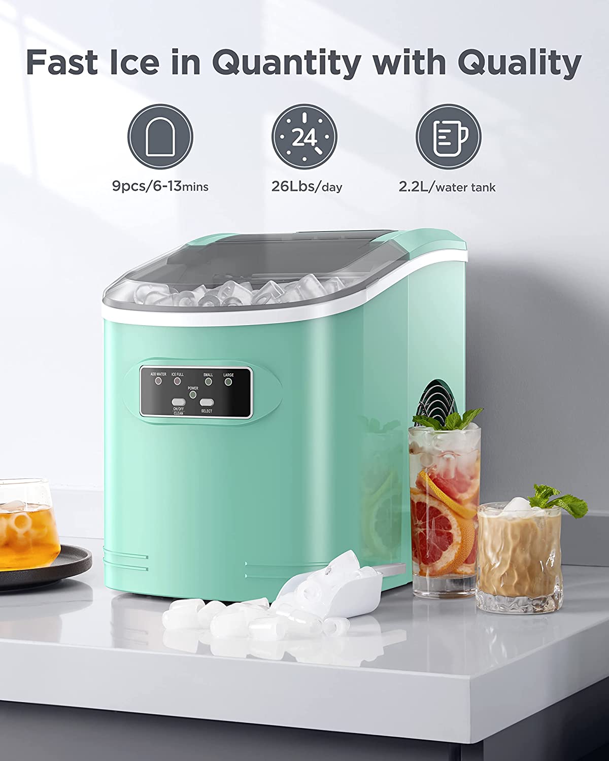 Ice Maker Machine Countertop, 26 lbs in 24 Hours, 9 Cubes Ready in 6 Mins, Self-Clean Ice Maker Compact Portable Ice Maker with Ice Scoop and Basket, Green