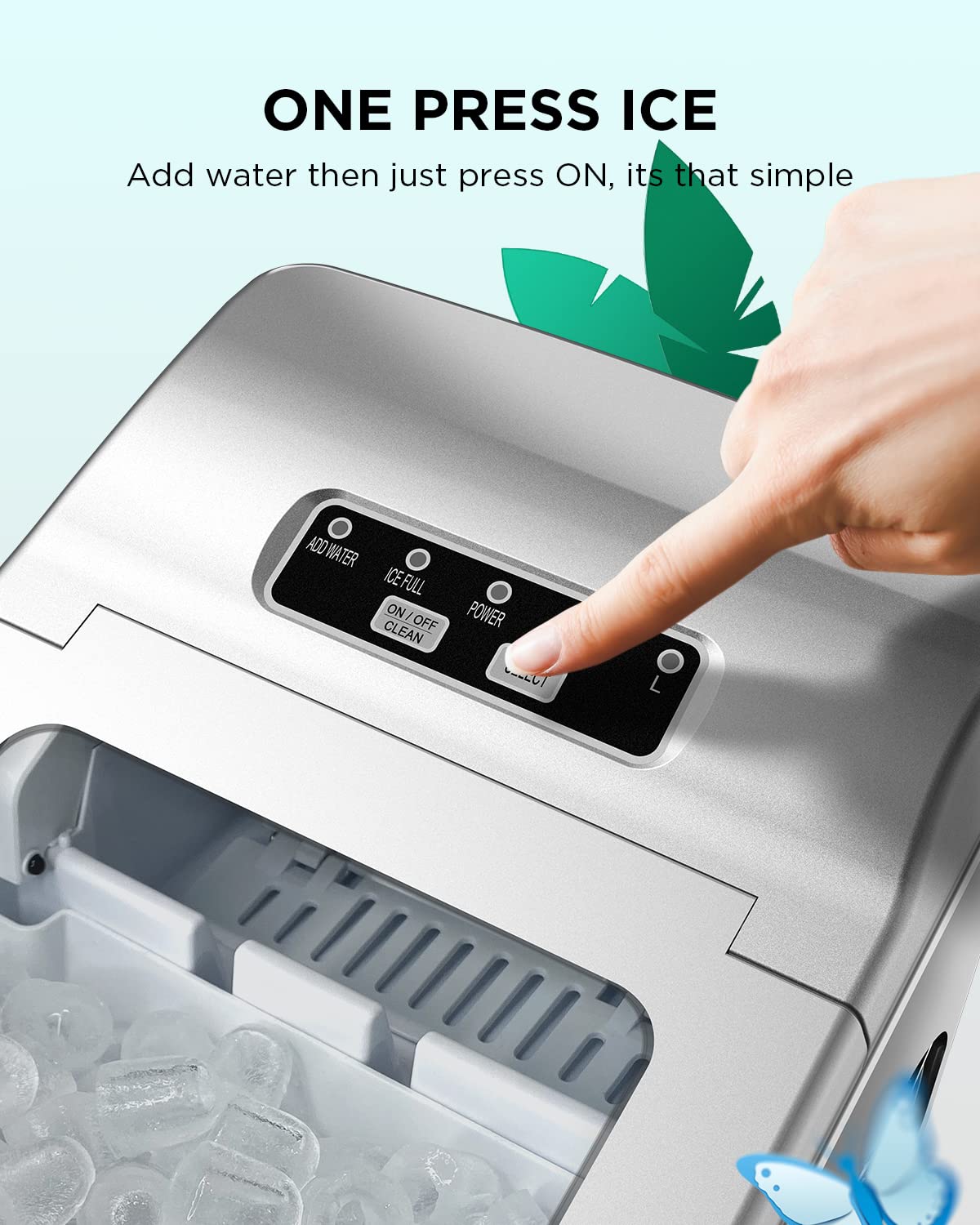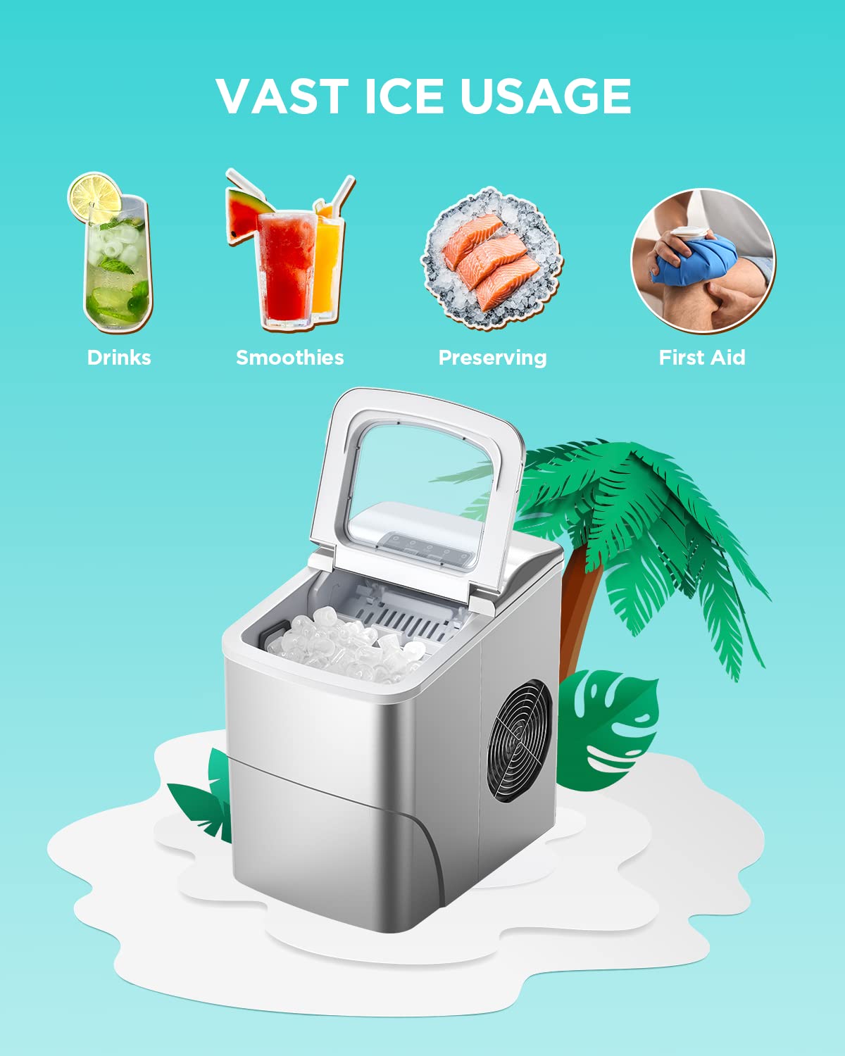 Stylish & Convenient Design: The Wizisa ice maker is easy to use and there is no need to install it. The silver stainless steel surface is very stylish and durable. We also offer an ice basket and ice scoop, so you can move the ice very easily. You can put the portable ice maker countertop anywhere you like, perfect for kitchen/home/office/party/bar.
