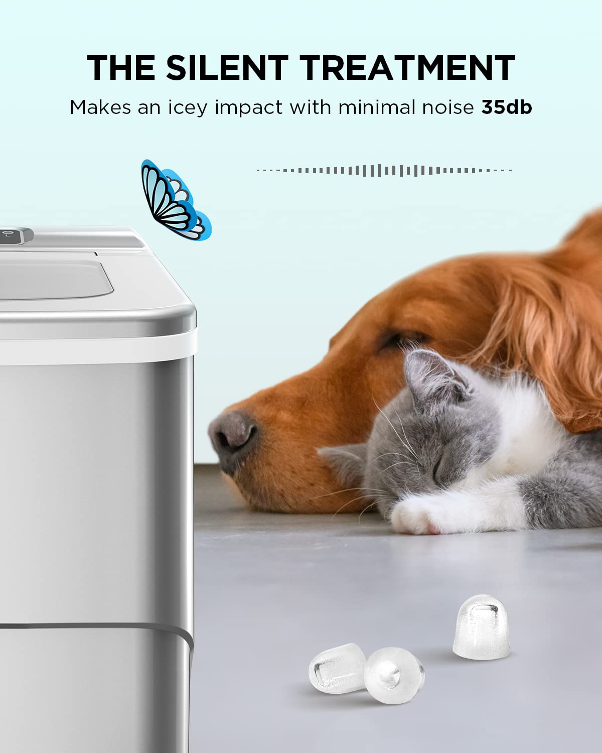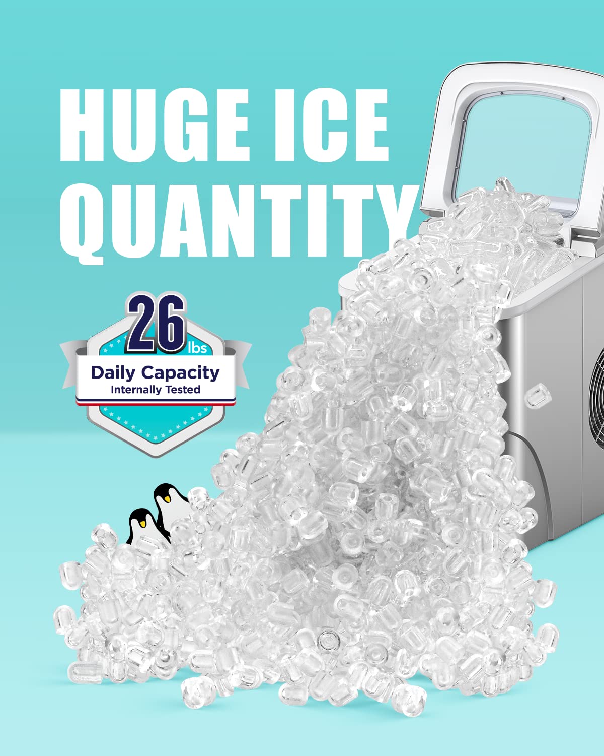Ice Maker Machine for Countertop, 9 Bullet Cubes Ready in 6 Minutes, 26lbs 24Hrs Portable Self-Cleaning, 2 Sizes of Bullet-Shaped Home Kitchen Office Bar Party, Silver (WSIM02)