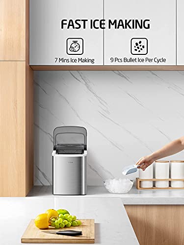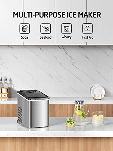 - Stylish & Convenient Design: The ice maker is easy to use and there is no need to install it. The silver stainless steel surface is very stylish and durable. We also offer an ice basket and ice scoop, so you can move the ice very easily. You can put the portable ice maker countertop anywhere you like, perfect for kitchen/home/office/party/bar.