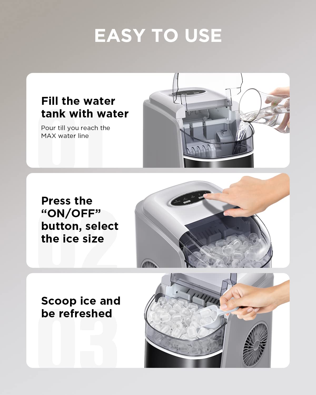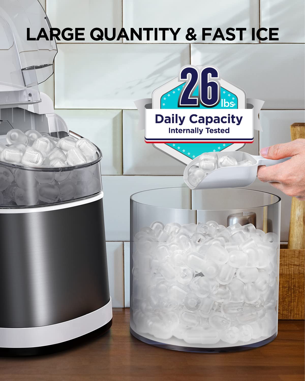 FAST ICE MAKER: The ice maker only takes 6 minutes to make 9 bullet-shaped ice cubes. Fill 2L of water into the water tank, maximum ice capacity can reach 26 pounds in 24 hours.