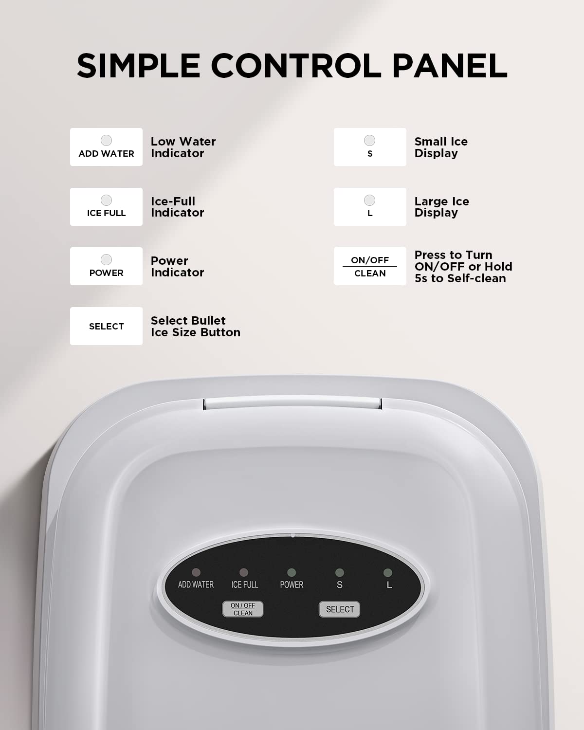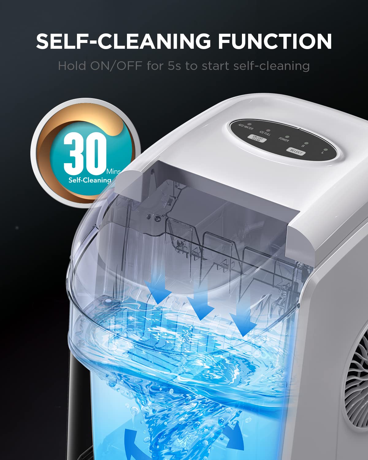 SELF-CLEANING & PORTABLE: ice Maker machine is portable and efficient with size of 14.09 x 10 x 12.91 inches. Press the ON/OFF button for 5 seconds to start the self-cleaning process.