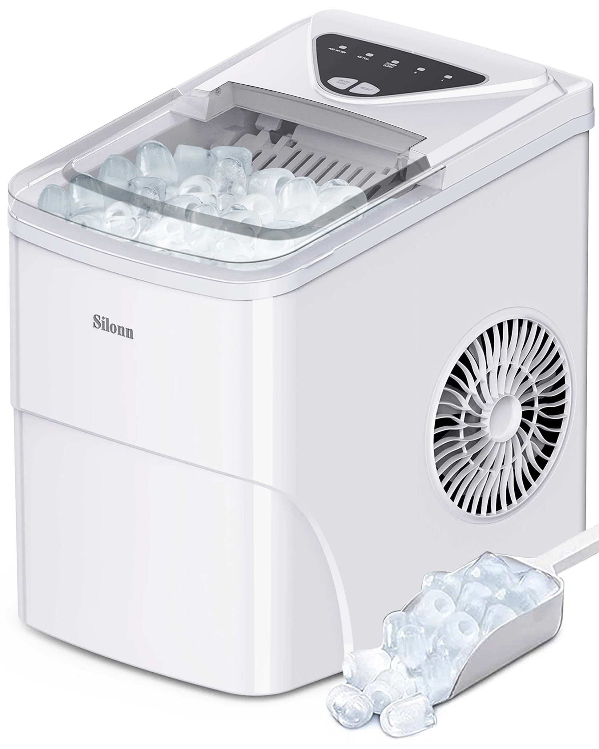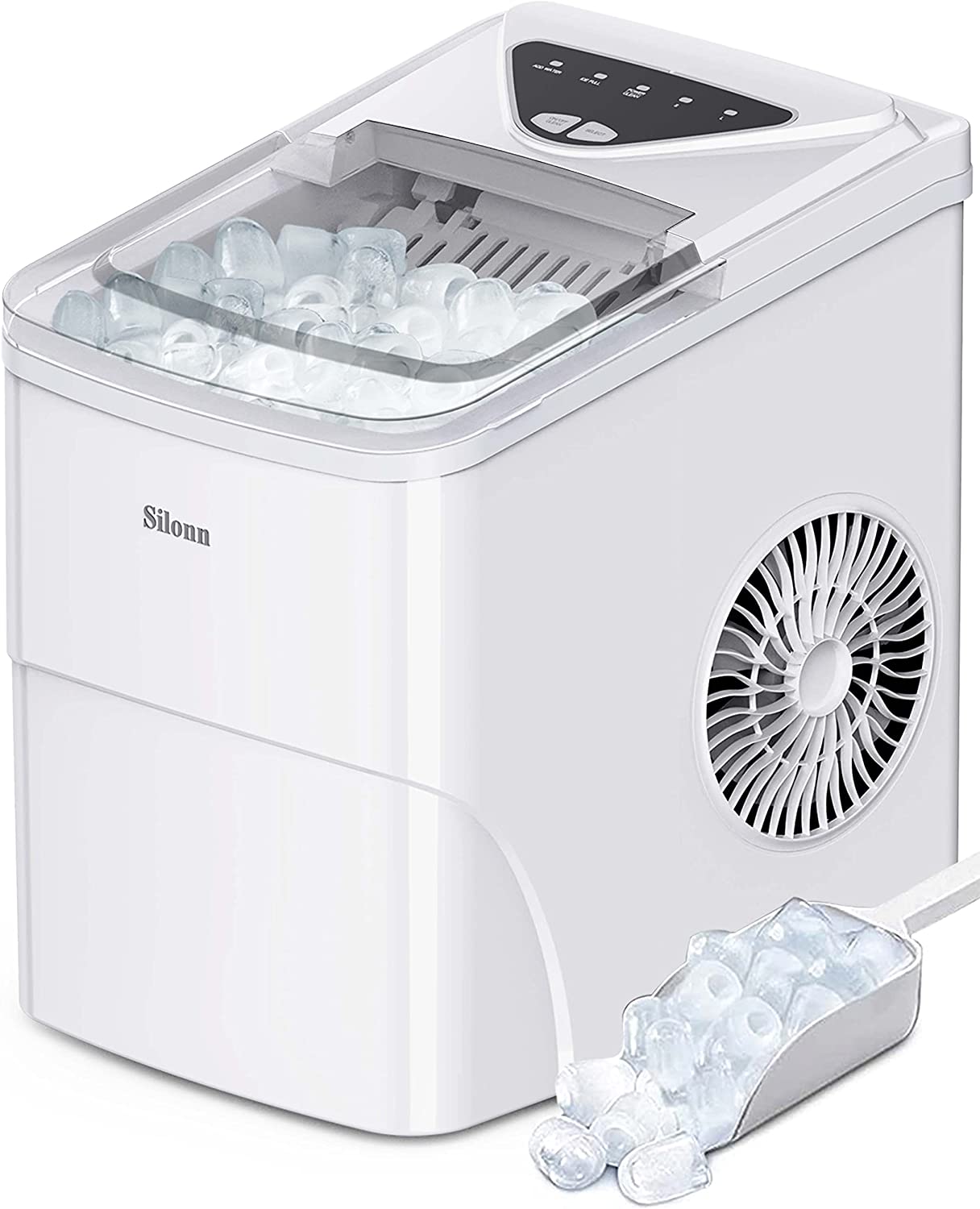 FAST ICE MAKER: The Silonn ice maker only takes 6 minutes to make 9 bullet-shaped ice cubes. Fill 2L of water into the water tank, maximum ice capacity can reach 26 pounds in 24 hours.