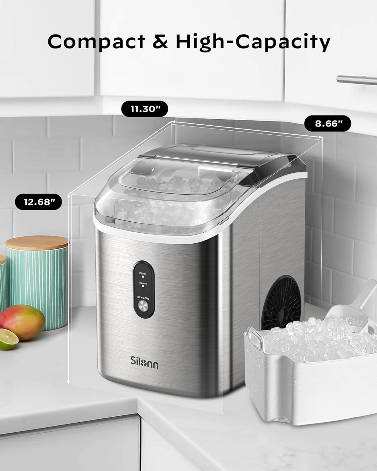 Nugget Countertop Ice Maker - Chewable Pellet Ice Machine with Self-Cleaning Function, 33lbs/24H, Sonic Ice Makers for Home Kitchen Office, Stainless Steel