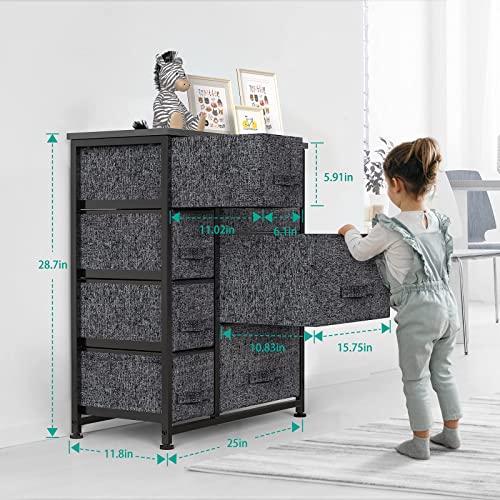 - Large Storage Capacity: Measured approximately 25” L x 11.8” W x 28.7” H. This closet dressers is designed with 7 drawers in split into two columns, and the different size drawers enable you to customize the stored item according to your need. The black dresser offer you with sufficient capacity to sort and organize your clothes, lingerie, underwear, toys, socks, crafting material, and many other different items.