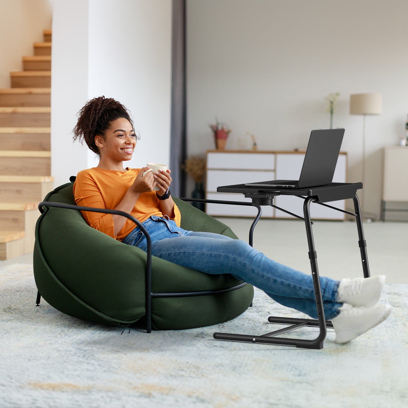 Our CHITOOMA adjustable tv tray table is your first choice for tv dinner tray on bed, sofa, couch, it meets all you diverse needs with its adjustment. Choose from 6 height settings between 19" and 28" for meals, work, or leisure. Easily adjust to your preferred angle for writing, reading, or dining with its 3 tilt angle. Retractable Cup Holder will be the best small design. If you do not need it, just fold and store under the sofa.
