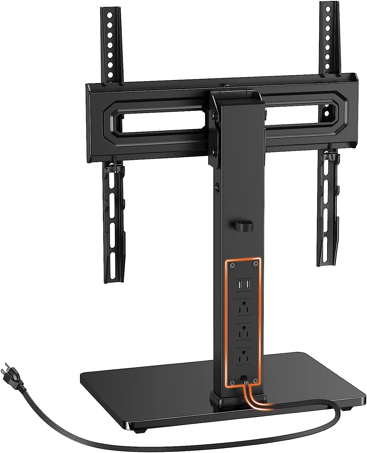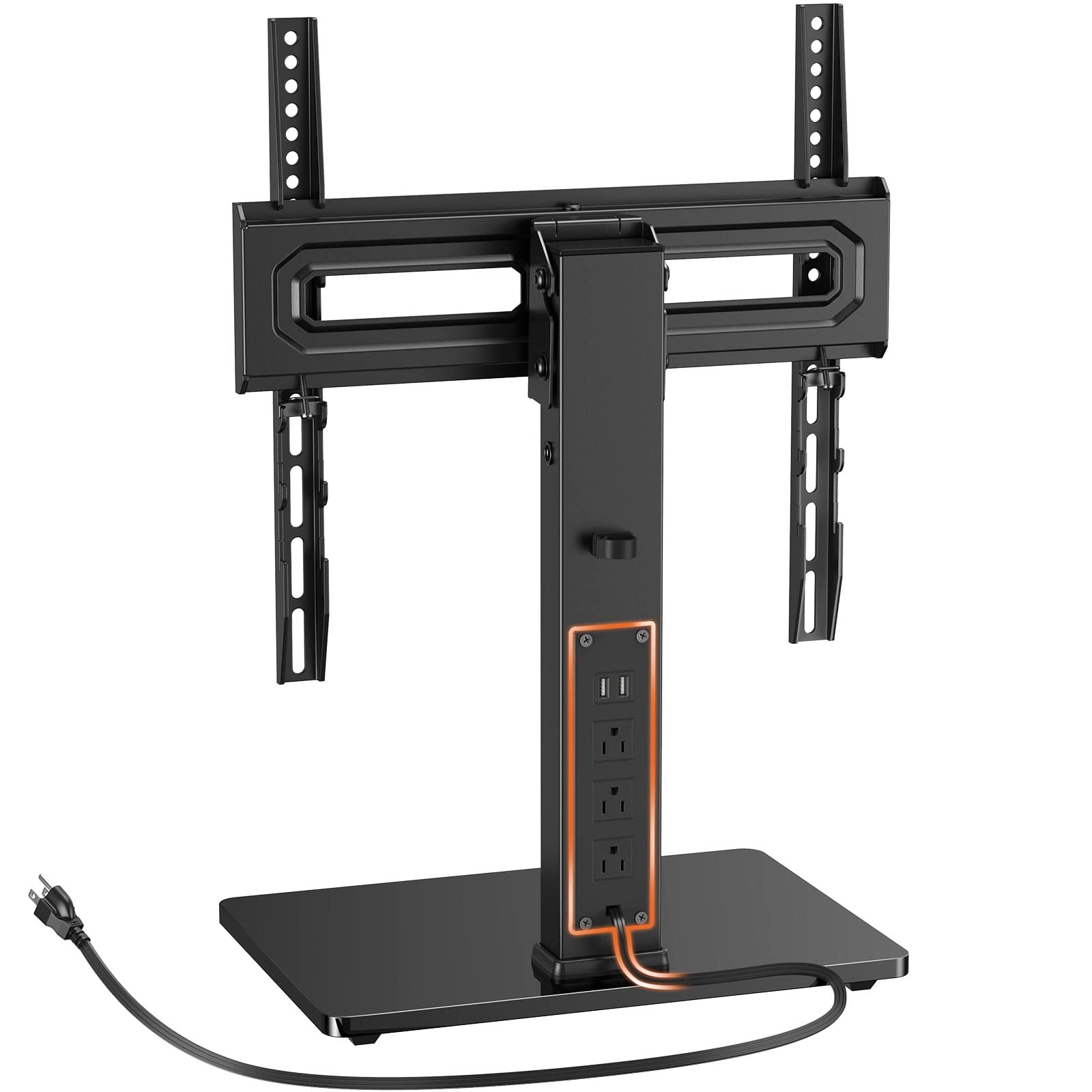 Integrated Power Outlet: The universal TV stand is equipped with a power outlet on the back of the column that provides 3 AC outlets, 2 USB ports, and a 6.56 ft power cord to charge your devices all in one place. The swivel TV stand also has cable management on the column to keep wires organized for a neat and clean look.