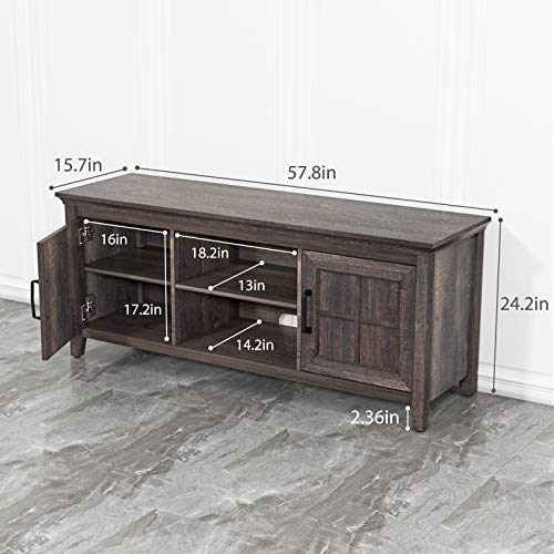 - SPACIOUS STORAGE: Overall dimensions of this wood TV stand are 57.8” (L) x 24.2” (H) x 15.7” (W). The top platform can hold TVs up to 65 inches in size. The left and right cabinets and the open storage in the middle each feature a shelf that is adjustable to three different heights. The legs hold the cabinet 2.36 inches from the floor for a low profile with more stability.